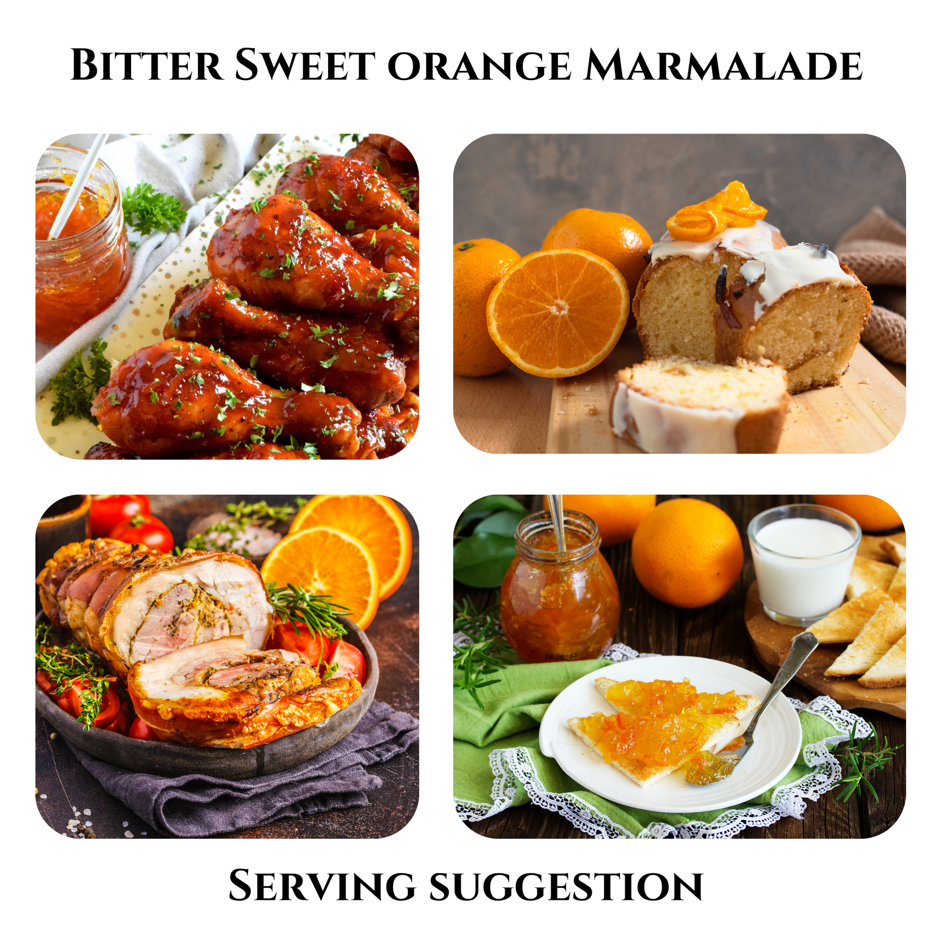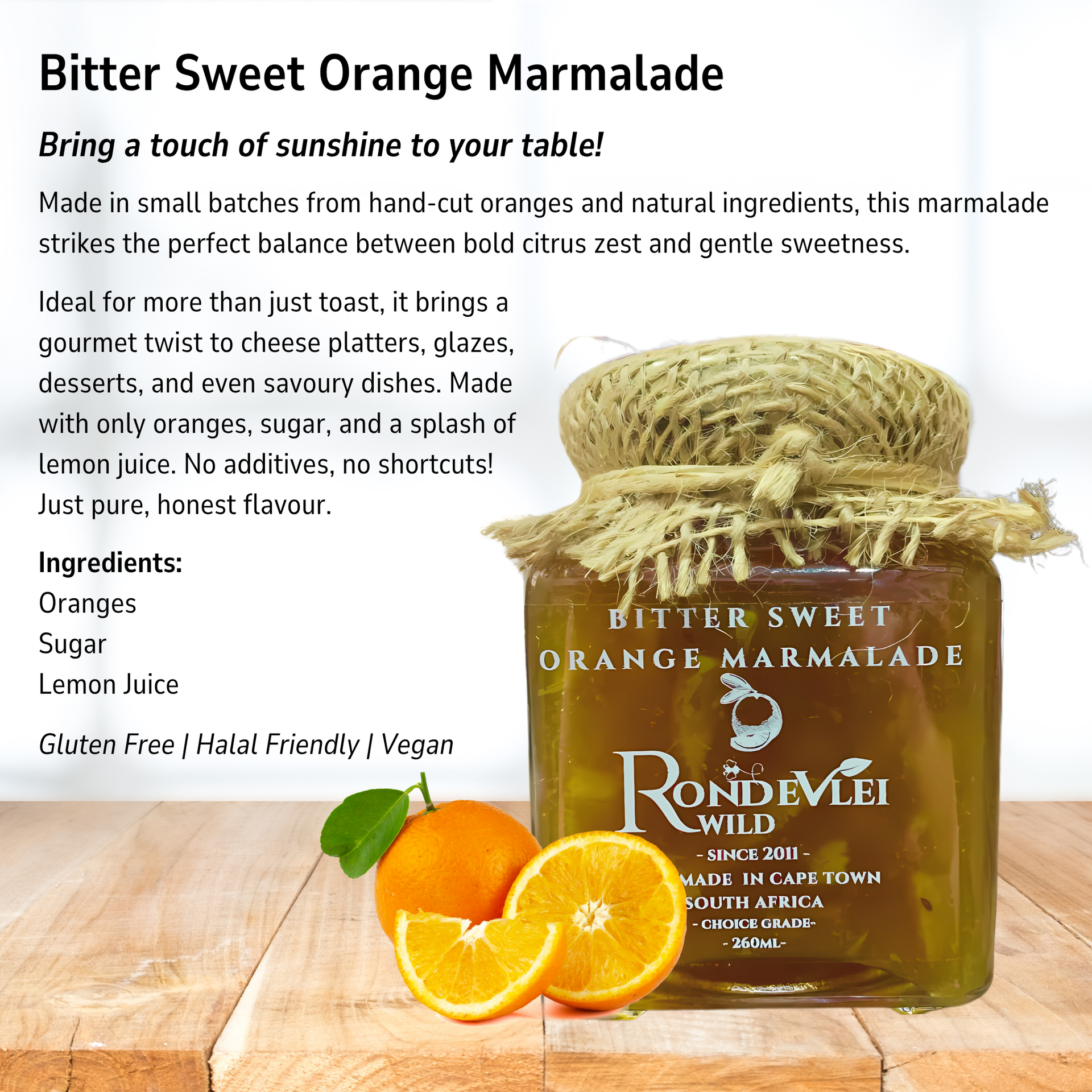 Ideal for more than just toast, it brings a gourmet twist to cheese platters, glazes, desserts, and even savoury dishes. Made with only oranges, sugar, and a splash of lemon juice. No additives, no shortcuts!