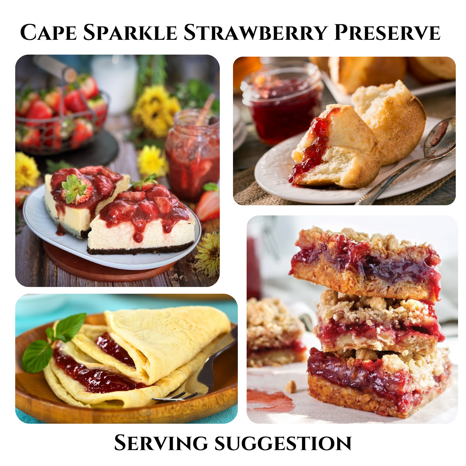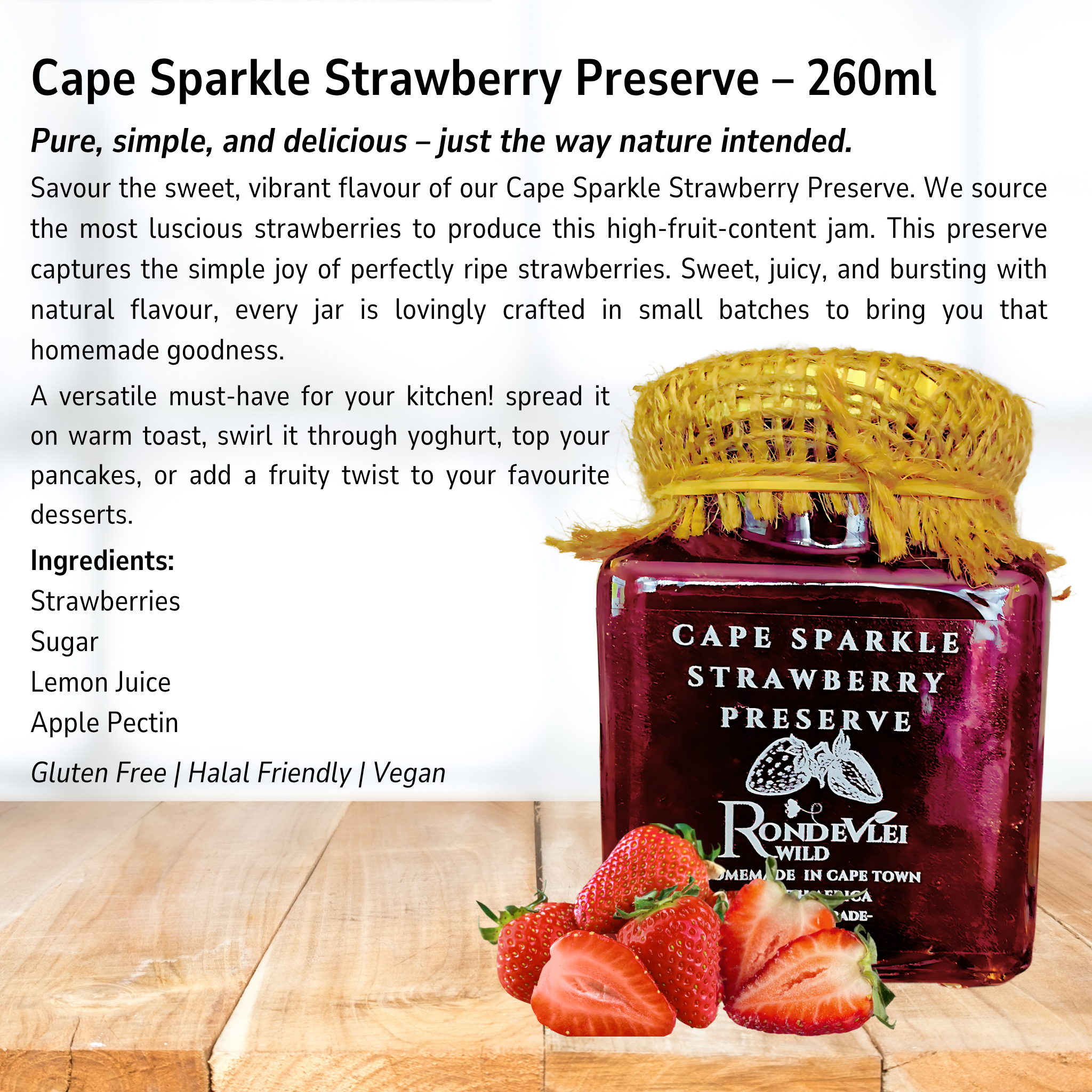 Savour the sweet, vibrant flavour of our Cape Sparkle Strawberry Preserve. We source the most luscious strawberries to produce this high-fruit-content jam. This preserve captures the simple joy of perfectly ripe strawberries. Sweet, juicy, and bursting with natural flavour, every jar is lovingly crafted in small batches to bring you that homemade goodness.